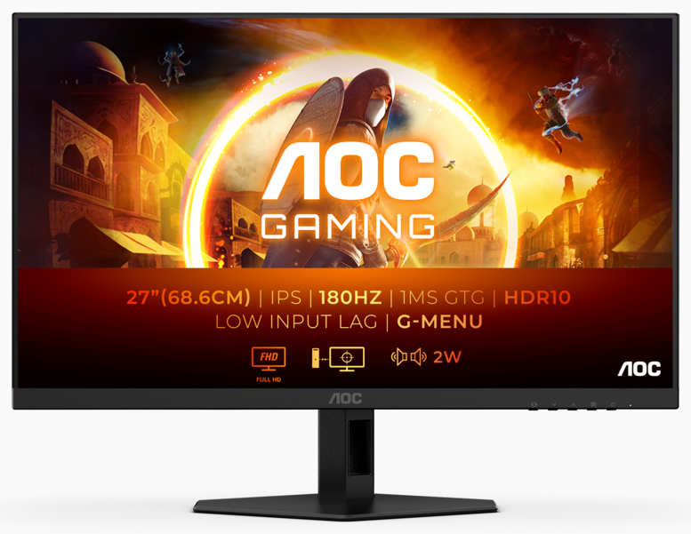 Монитор LCD 27" AOC 27G4XE, Fast IPS, Black, 1920x1080, 180Hz, 80M:1, 300cd/m2, 178/178, 1ms MPRT, Adaptive sync, G-SYNC Compatible, HDR10, VESA 100 x 100, регулировка по наклону, динамики 2x2W, 2xHDMI и DP1.4, выход на наушники (HDMI, DP в комплекте)
