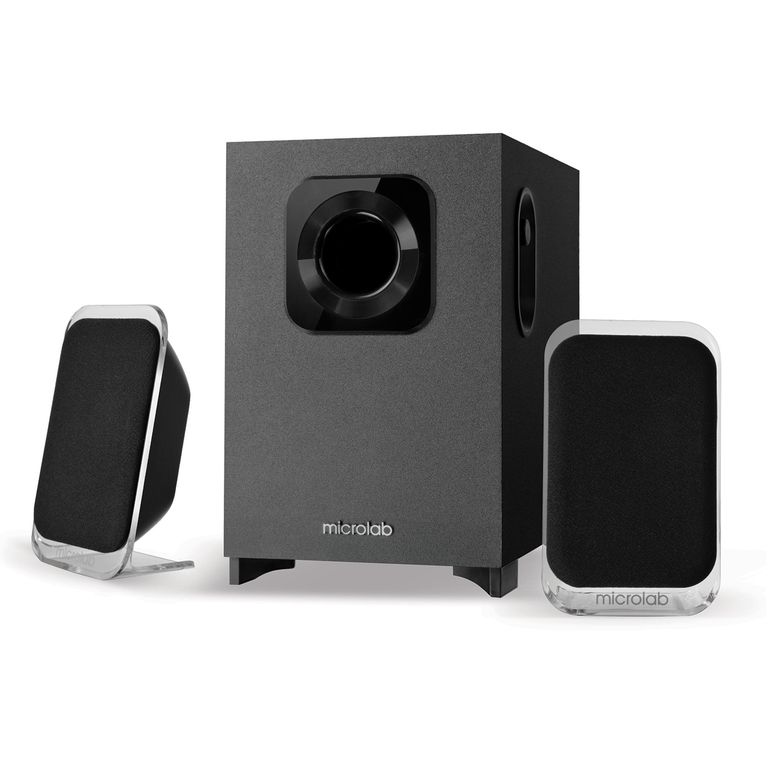 Стильный дизайн задают прозрачные пластиковые грани сателлитов и сабвуфер правильной формы с фазоинвертором, выведенным на переднюю панель. Динамики закрыты акустической тканью. Панель управления выведена на боковую стенку, не перегружая внешний облик системы.